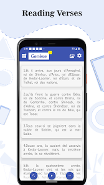 ด้วย La Sainte Bible en Français ผู้ใช้สามารถพกพาเวอร์ชันขนาดกระเป๋าของพระคัมภีร์ เสนอคำแนะนำและแรงบันดาลใจในชีวิตประจำวัน แอปพลิเคชันมีฟีเจอร์เช่น คำคมที่แสดงบนภาพ วิดีโอของการสอนในพระคัมภีร์ และภาพพื้นหลังที่เป็นธีมทางศาสนา ผู้ใช้สามารถค้นหาคำพิเศษ รับบทความประจำวัน และจัดระเบียบบทความที่ชื่นชอบในห้องสมุดส่วนตัว